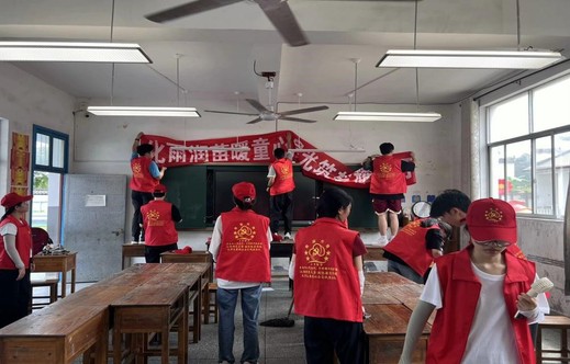 “化雨润苗暖童心,星光筑梦耀游汀”——实践队员们来到了游汀村小学,张挂横幅,布置教室,绘制板报,做好义教前期准备工作。