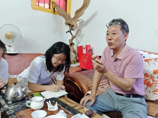 图为实践队员与陈亮大师交谈竹衣的传承与发展