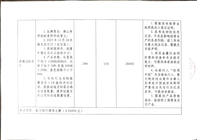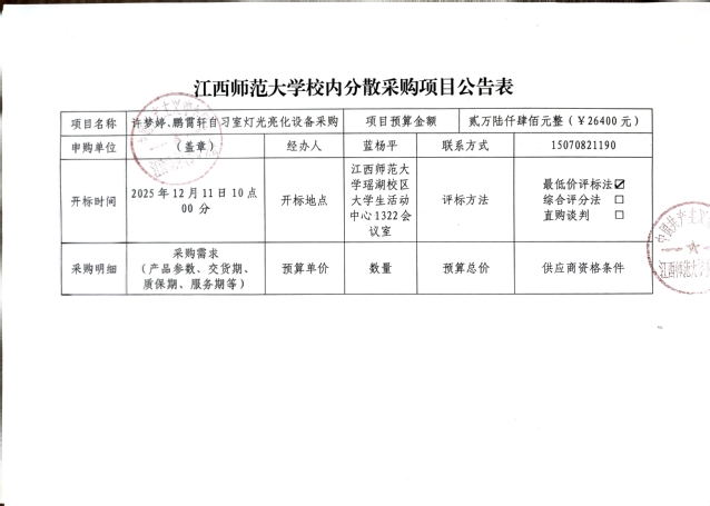 为进一步保障学生用眼健康,优化许梦婷、鹏霄轩自习室自习环境,提高许梦婷、鹏霄轩自习室照明亮度,经报学校审批同意,现拟采购一批护眼LED灯光设备,采购招标公示期为:2025年12月8日-11日,开标日期、地点为:2025年12月11日上午10点于江西师范大学瑶湖校区大学生活动中心1322会议室,具体招标要求见附件。