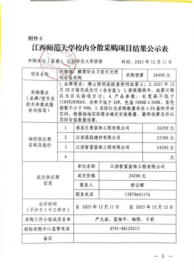 江西师范大学许梦婷、鹏霄轩自习室灯光亮化设备采购项目结果公示
