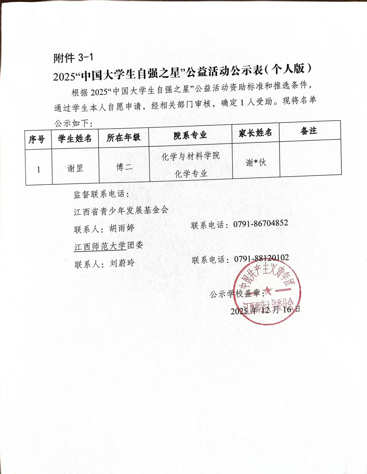 根据《关于组织开展2025“中国大学生自强之星”公益活动推荐申报工作的通知》的要求,经个人申报、学院推荐、校团委评审评议,现将拟推荐人选名单予以公示。